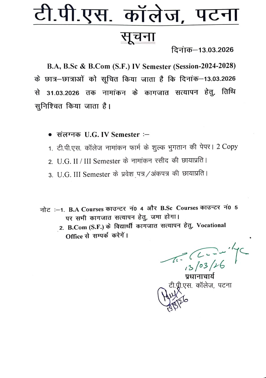 Notice regarding document verification for B.A., B.Sc., and B.Com. Semester IV admission.